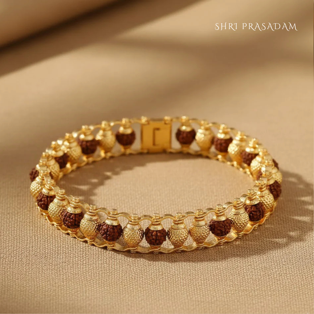 Dual-Line Rudraksha & Gold Polished Beads Kada Bracelet features a strong double-line design crafted with natural Rudraksha beads and smooth gold-polished beads. The kada-style bracelet offers a bold yet spiritual look, symbolizing balance, strength, and devotion.