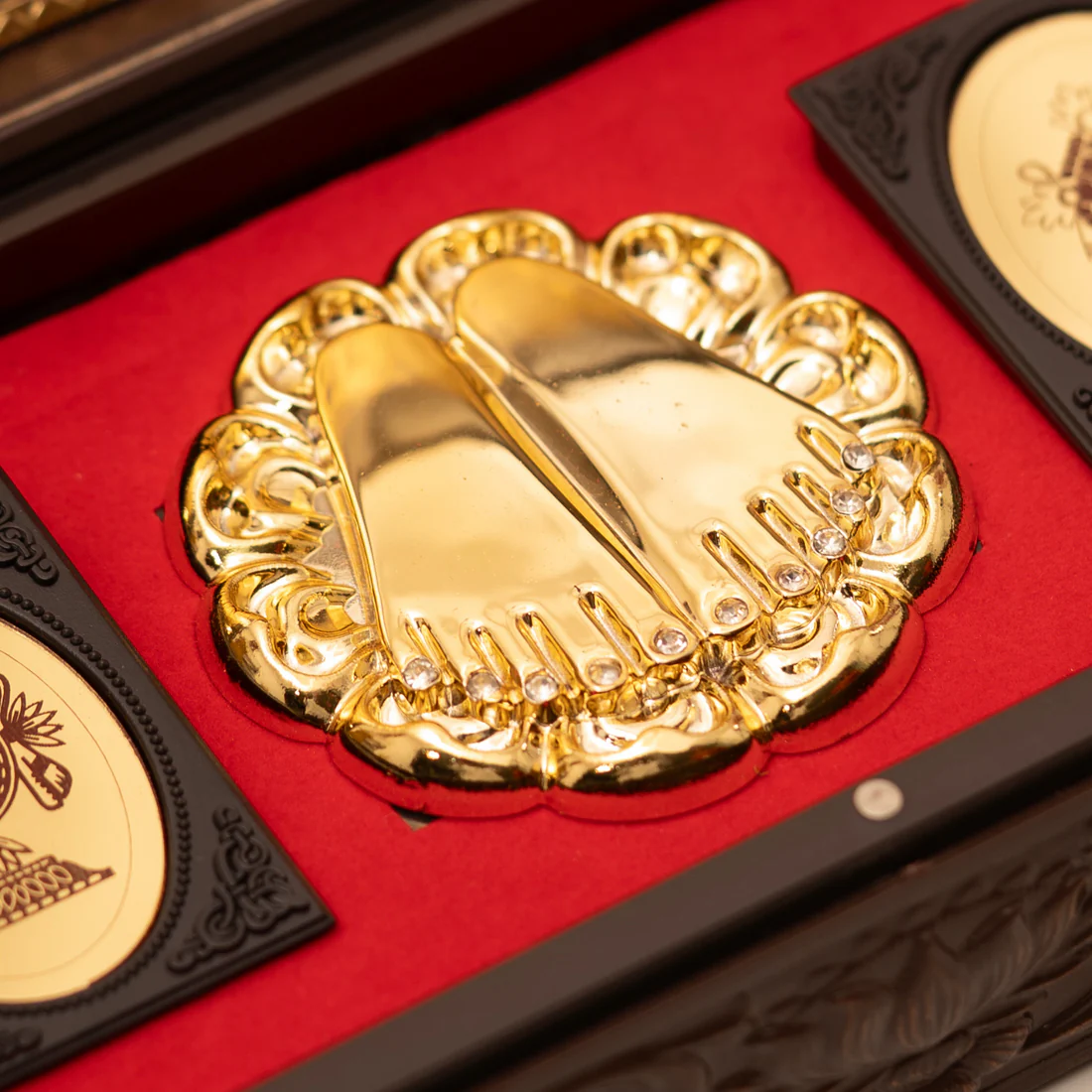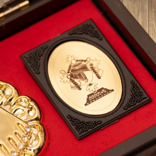 Gold Plated Shri Tirupati Balaji Lakshmi Padmavati Pocket Temple with Dry Fruit Box is a divine ensemble that beautifully blends sacred devotion with festive elegance. This exquisitely designed pocket temple features Lord Venkateswara (Balaji), Goddess Lakshmi, and Goddess Padmavati, finely detailed and gold-plated to reflect their divine radiance and spiritual grace.
