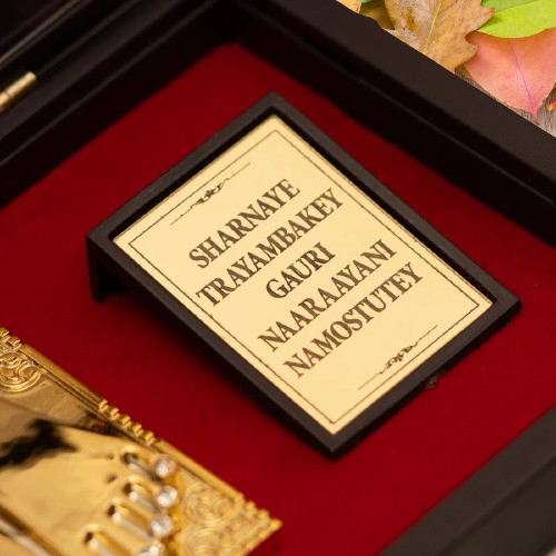 The Gold Plated Mata Vaishno Devi Pocket Temple is a beautifully crafted symbol of devotion, strength, and divine protection. Featuring a radiant image of Mata Vaishno Devi, this compact temple is elegantly finished with a lustrous gold plating that captures the grace and power of the revered goddess.